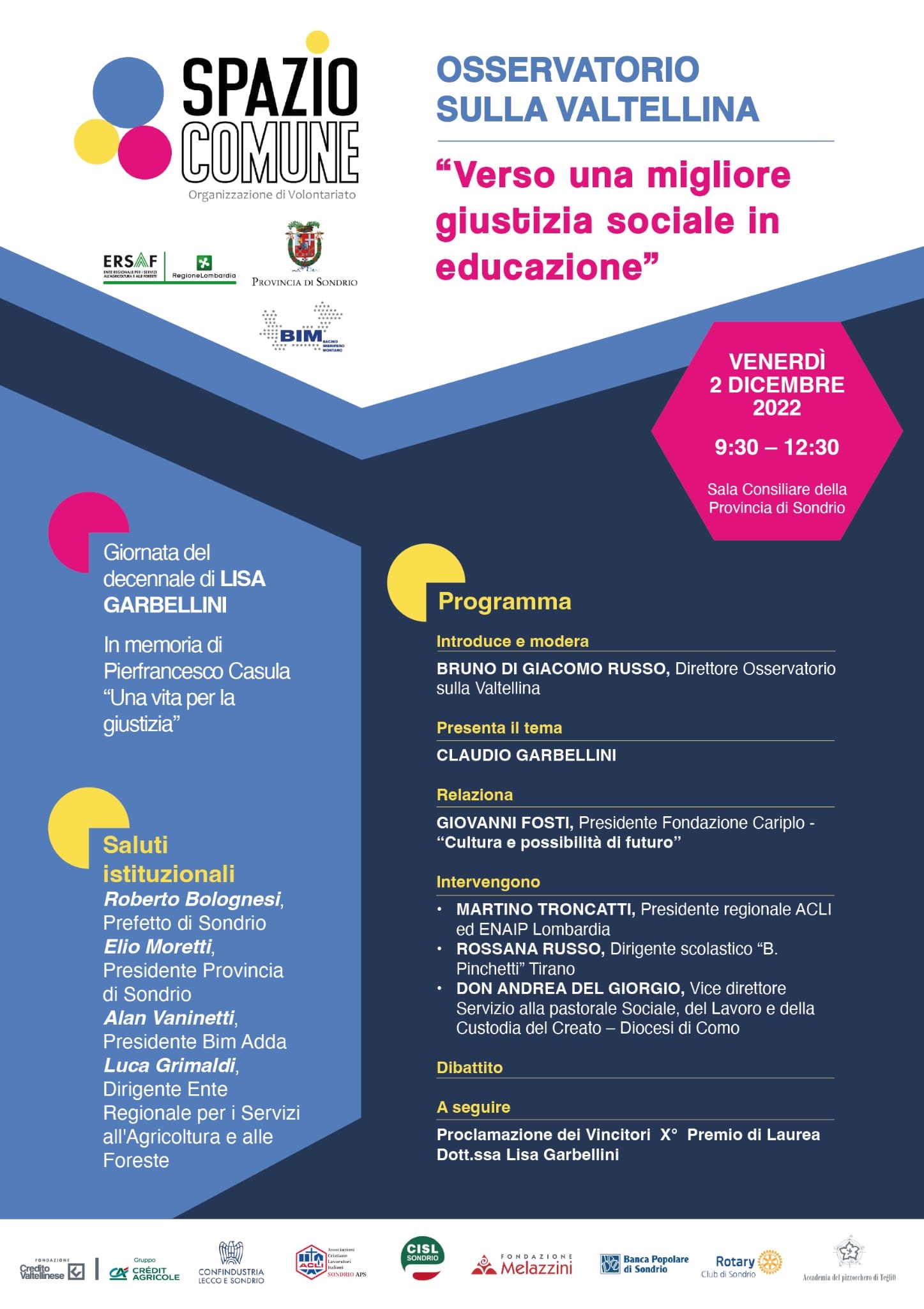 Venerdì 2 dicembre h. 9-12.30, presso la Sala Consiliare della Provincia di Sondrio, si terrà la X Giornata in ricordo della Dottoressa Lisa Garbellini, giovane ricercatrice di ERSAF scomparsa prematuramente.